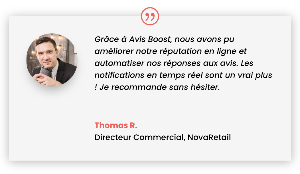 Avis Boost est une plateforme qui permet aux entreprises de centraliser, surveiller et analyser leurs avis en ligne. GrĂące Ă ses intĂ©grations avec de nombreux sites dâĂ©valuation, elle facilite la gestion de la rĂ©putation en ligne et lâamĂ©lioration de lâexpĂ©rience client. Ses fonctionnalitĂ©s incluent des alertes en temps rĂ©el, des rapports analytiques dĂ©taillĂ©s et des outils dâautomatisation pour rĂ©pondre aux avis.